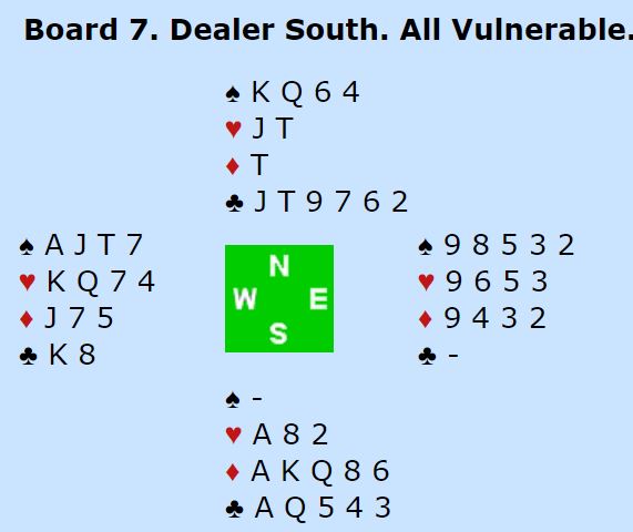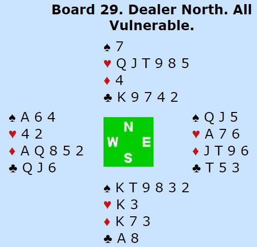 Syd hadde glimrende kort mot nord sine. Det går likevel an å bet 4 hjerter, men da må forsvaret raskt spille to runder trumf. I så fall blir det en taper i hver farge. Hvis ikke syds trumf blir tatt bort godspilles kløverfargen som sitter så snilt med en stjeling. Men å se det det er ikke så lett. Og motspillet ble ikke funnet, så det endte med ti stikk og +790 til Belgia.