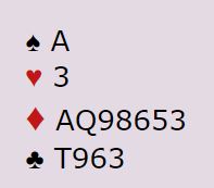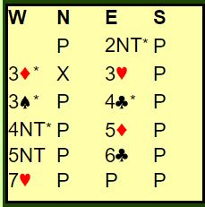 Med en god syvkorts farge er det vel klart at slem godt kan stå selv om makkerparet har mindre enn 30HP til sammen. Ingunn overførte til hjerter og avga en sleminvitt. Ved begge bord startet det med 2NT og 3 ruter fra vest, og ved begge bord doblet nord for ruterutspill.