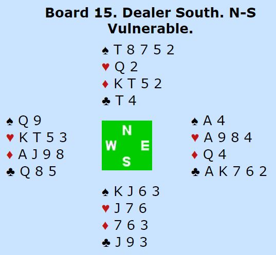 Men flaksen var i alle fall der, for jeg hadde firekorts spar også (4-4 i major) så trumfstøtte til makkers var på plass. Så kontrakten viste seg å være grei nok selv om makker fikk sjokk idet en helt annen blindemann ble lagt opp enn det han regnet med. Og 20-åringen på andre siden av bordet spilte slemmen godt, tolv stikk og +1430. Det var gevintsspill siden de stoppet i utgang ved det andre bordet.