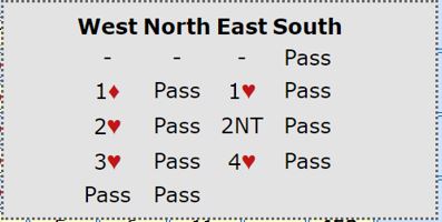 Østs 2NT er en slags rele som spør om mer, bla. om vest har trekorts eller firekorts hjerterstøtte. Da vest viste firekorts hjerterstøtte, men minimum tenkte øst korrekt at det neppe var noen god slem.