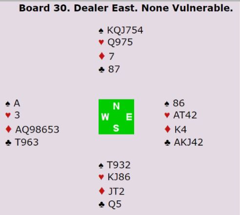 Ved det andre bordet åpnet nord med 4 spar som en normal person. Syd var ikke med til 5 spar. Mine lagkamerater som var klart bedre enn oss i grunnspillet var skuffet over sin avgjørelse i dette spillet siden de frivillig meldte seg opp i 6 kløver som gikk en bet, +100. Men denne gangen ga det 14 IMP inn med resultatet fra vårt bord som vi leverte sammen med en «crazy» historie.