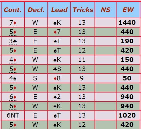 Mange av de andre parene fikk problemer i dette spillet, som regel etter åpning med 1 kløver. Slik så resultatene ut for hele puljen: