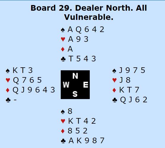 I teorien kan trumfen løses uten taper med damen som feller tieren, så en dobbelfinesse over østs beholdning. Men å spille sånn er kun med åpne kort og mot oddsen. Det ble en bet, og det norske laget plukket opp 11 IMP siden Anders Brogeland-Magnus Sætre spilte 3NT med elleve stikk.
