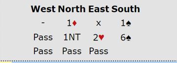 Så å tenke på slem er vel for de aller fleste ikke på radaren. Men det er en gambling som i denne situasjonen kan fungere med mange normale hender hos nord. Det kommer ganske sikkert hjerter ut. Hvis nord har hjerter ess, men ikke kløver ess kommer kanskje hjerter ut så forsvinner kløvertaperen. Hvis nord ikke har hjerter ess ligger det bra an etter hjerter ut, og skulle det være nødvendig med et rutervalg spilles på at den som doblet og meldte hjerter etterpå (øst) har korfarge i ruter.