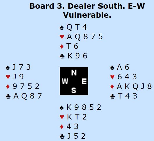 Å få spille 3 hjerter er vel normalt. Da må spar knekt lokaliseres for å få ni stikk. Å få +140 N/S ga 74%. Å gå en bet i 3 hjerter 34%. Og å spille mot 3 ruter å få fatt i en bet ville gitt 54%.