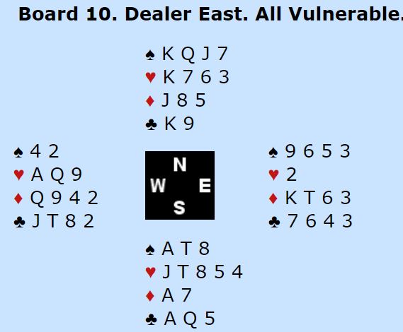 En kan se for seg at ruteren ikke var fordelt sånn som her, og om det i så fall hadde kommet et annet utspill enn ruter ville Ø/V fått seg en litt ufortjent topp i 3NT. Men her kom selvsagt ruter ut, og kontrakten kunne ikke vinnes.