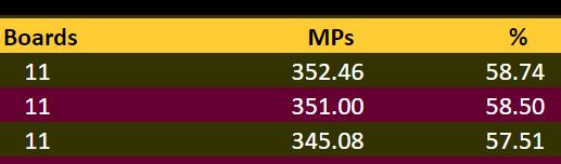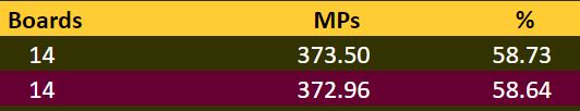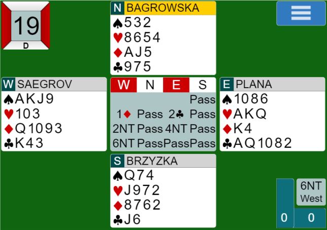 Så meldte paret som fikk den bunnen i første spill godt til 6NT som ble vunnet. Å sitte i mot det ga 33% til Plana-Idland Sægrow. I det spillet fikk imidlertid paret som de kjemper hardest mot i øyeblikket +1700 i motspill mot 2 hjerter doblet, og det slo de som var i 6NT med tolv stikk.