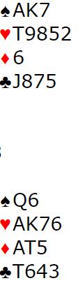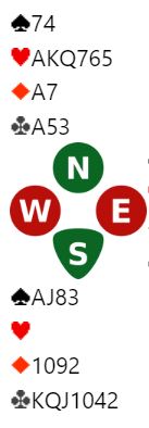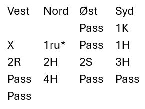 Herland-Skimmeland spiller med «kløverføringer». Så nords 1 ruter viste hjerterfarge, og syds 1 hjerter viste slik de spiller tre eller fire hjertere. Skimmeland ble optimistisk da syd var med til 3 hjerter selv om han vet syd har 11-13 balanserte, og han løftet til en hardmeldt utgang.