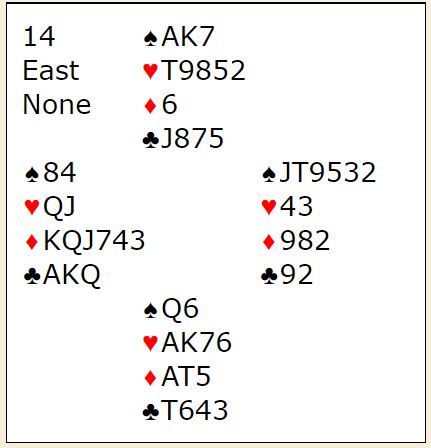 En er å vinne utspillet med kløver ess og stjele en hjerter. Så ut med trumfen. Hvis trumfen sitter 2-2 er det helenkelt. Da kan nords tredje kløver brukes som inntak til å stjele en hjerter til i tilfelle den fargen sitter 5-2, og eventuelt ta tretten stikk om hjerteren sitter 4-3. Eller en kan legge seg på tolv stikk ved gi bort ett sparstikk og stjele en spar, altså om trumfen sitter 2-2.