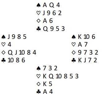 Ved det ene bordet ble ruterutspillet vunnet med esset fulgt av trumf. Øst stakk med esset, vest fulgte farge, og øst spilte nok en trumf mens vest kastet en ruter. Så prøvde spillefører to bra sjanser. Først kløver ess og kløver mot damen. Idet vest la kløver 8 andre gangen ble damen prøvd. Men øst stakk med kongen og spilte liten kløver tilbake. Spillerfører trumfet, og vest fulgte med knekten. Så ble spar til damen forsøkt, men det gikk galt da hele spillet så slik ut:
