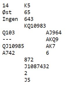 Men øst er våken og melder 5 spar, tar vekk et melderom for N-S på vei til slem. Da kommer en tredje løsning inn, konvensjonen DOPI, det betyr at dobling viser 0 ess, pass 1 ess. Har du mot formodning flere så meld neste trinn. Her altså ett ess, pass. Og da mente Nord det fikk være nok og meldte en sjanserik 6 hjerter. Med spenstig utspill av ruter K ble det alle stikkene.