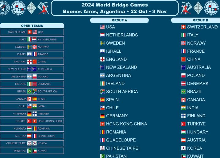 Jeg fulgte med på trekningen og var litt spent på om om det kunne bli «hatoppgjør» i grunnspillet, Norge mot New Zealand som jeg selv skal spille for. Men det ble det ikke, NZ havnet i Group A. Det ser ganske toppsterkt ut der også. NZ var i sjette «par», og dermed i følge seedingen antatt å ha en sjanse til å klare topp-8. Litt overraskende høyt seedet, spør du meg. Alle de fem lagene seedet foran oss i pujen havner veldig sannsynlig på topp-8, og minst 5-6 nasjoner til må regnes på nivå med oss, kanskje sterkere. Vi har tross alt med to debutanter i år, og en av dem, makkeren min er bare 21 år gammel og har spilt bridge i 4-5 år. Vi får se...