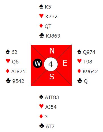 Resutatene på spillet varierte fra noen som gikk bet (3NT) til utganger i hjerter med fra ti til tretten stikk. Merk at det kan bli kun ti stikk om det tas hjerterfinesse etter å ha fått kløver ut. Vest vinner stikk for hjerter dame. Forsvaret får også ett stikk i ruter og en kløverstjeling om de finner motspillet. Å vinne utgangen akkurat (+620) ga -4 (max: -23). Det var to par som fikk alle stikkene i 4 hjerter og delte toppen N/S, og ett av dem var vinnerparet torsdag ettermiddag.