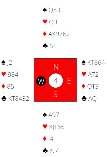 Vest passer stort sett overalt, selv de sprekeste finner neppe på noe i sonen med de kortene. Nord åpner med 1 ruter. Det vanlige er at øst melder inn 1 spar, men noen sier kanskje 1NT med 15, ruterstopper og ellers en jevnt fordelt hånd. Det kan se ut som Ø/V er i trøbbel hvis øst sier 1NT, syd har jo bra kort også. Men om de blir doblet i 1NT kan vest flykte til kløverkontrakt.