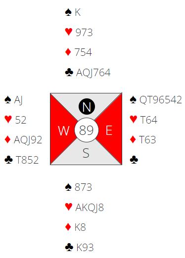 På den siste trumfen er syd ferdig, han blir skviset. Hva denne skvisen heter er jeg ikke helt sikker på, men det er vel antagelig en såkalt skvis uten tempo (?). Uansett, hvis syd kaster en hjerter forsvinner en kløver fra vest og spillefører tar fire hjerterstikk.Om syd kaster kløver knekt spilles liten kløver og esset kommer på, resten står.