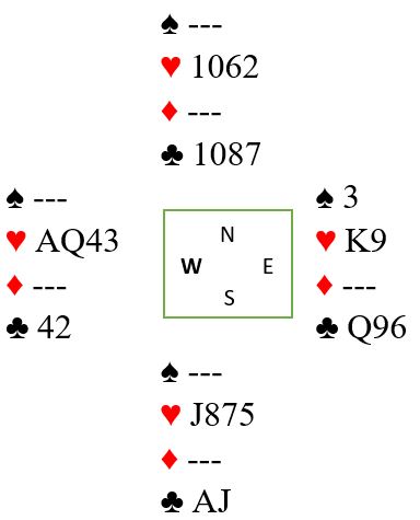 Nicolai stjal altså den andre ruteren og tok noen trumf før han også stjal vests tredje ruter. Så fulgte kløver mot kongen. Hvis syd tar for esset blir det elleve enkle, men syd la selvsagt liten og kongen vant stikket. Nå ser spillefører at det blir elleve om syd startet med dobbel kløver, da kommer esset "på luft" som man sier (liten fra begge hender), men før han ville prøve om det satt slik kjørte han i gang med trumfene. Da den nest siste trumfen ble spilt måtte syd kvitte seg med sin siste ruter for å holde fire hjertere og A-J i kløver. Det så slik ut med seks kort igjen: