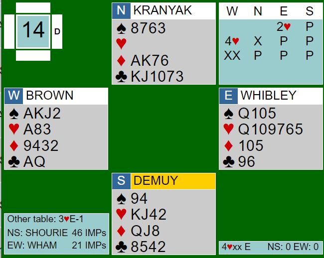 Kontrakten 4 hjerter redoblet går bet med kløver ut. Hjerteren må i så fall tippes for å få ni stikk, men det valget ble ikke vanskelig for Wibley slik meldingene hadde gått. Det blir også bet med for eksempel ruter dame ut som må være et alternativ for syd. Han får det stikket og kan skifte til kløver. Kanskje bør nord legge svakhet i ruter for å få kløver i skift fra syd? Eller nord kan stikke over den første ruteren og spille ruter til syd som i så fall trolig finner kløverskiftet. Om han får for ruter dame kan syd også ta for knekten i andre stikk før det skiftes til kløver. Da får forsvaret minst fire stikk.