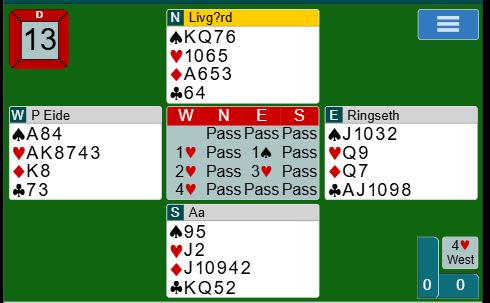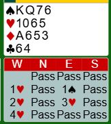 Vest har altså som du ser åpnet med 1 hjerter og meldt 2 hjerter andre gangen over svaret 1 spar. Så vest har vist sekskorts hjererfarge. Øst inviterte med 3 hjerter som vest la på til utgang. Hva ville du spilt ut?