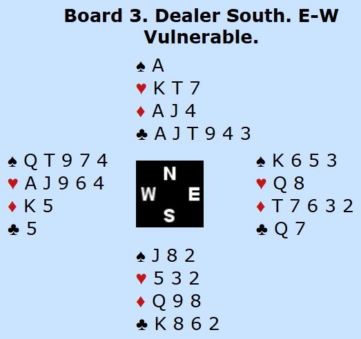 Sofie (nord) ble spillefører i 3NT etter at meldingene hadde staret med to passer, så 1 kløver (nord), 1 spar (syd) som viste 6-9NT eller ruterfarge (kløverføringer), og 1NT fra vest. At den grandmeldingen etter pass viste begge major var ikke øst sikker på, og meldingen ble forklart forskjellig på de hver side av skjermen. Sofie doblet 1NT, det gikk pass fra øst og 2 kløver fra Elisabeth med syds kort. Da sa Sofie 3NT. Og hun forstod hva det handlet om, at vest hadde tofargehånd.
