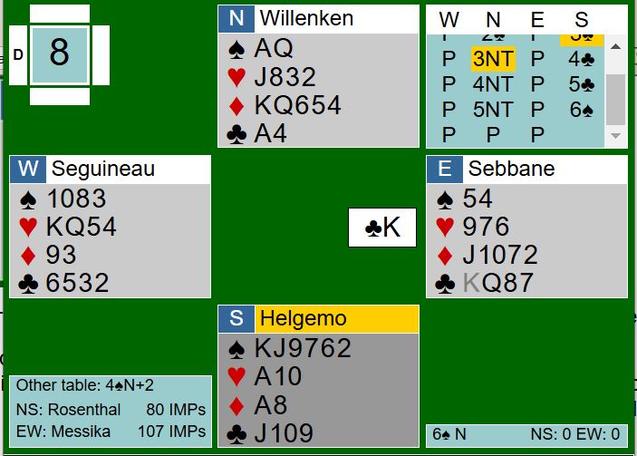 Willenken gikk også bet i en 6 kløver som kunne vært vunnet. Spilleføringen der kan sikkert diskuteres, men det er kanskje en del å si i favør den aktuelle vinnervarianten. Det ble imidlertid uavgjort spill, og vi lar det ligge. Men se her: