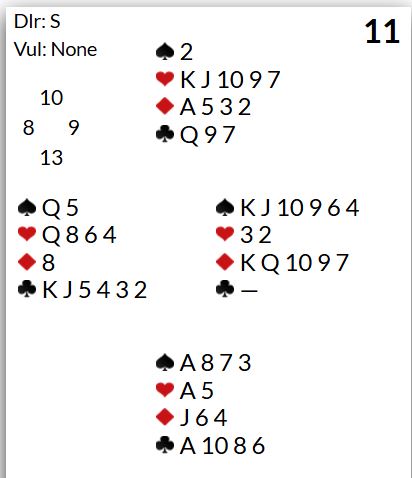 Bak +1190 til N/S kom ett par med +650 for 5 ruter doblet med tolv, to par med 4 ruter doblet med elleve stikk som gir +610, og tretten (!) par med 5 ruter doblet med elleve stikk (+550).