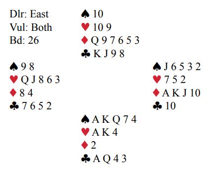 Berkowitz åpnet som syd med 2 kløver og fikk 2 ruter fra Meckstroth. Over syds 2 spar sa nord 3 ruter, og syd avsluttet med 3NT. Vest spilte uheldig ut liten hjerter sånn at tieren vant første stikk – en god start for spillefører. Fortsettelsen var spar 10 som fikk seile! Øst dekket ikke, og det er naturlig siden han har så tynt under knekten. Om syd har for eksempel nieren og åtteren i stedet for 7-4 vil han få fem sparstikk hvis øst dekker. Og om det dekkes faller likevel 9-8 sånn at syveren blir stikk og det blir fire sparstikk.