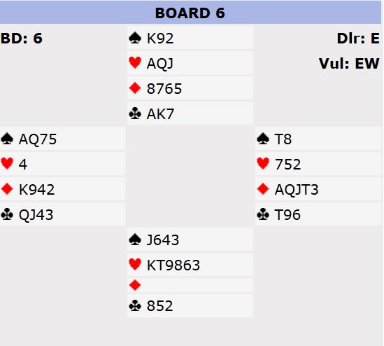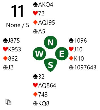 Det ble imidlertid et enkelt spill da vest prøvde liten hjerter ut som gikk til syds dame som ga det tolvte stikket. Øst fikk for ruter konge, men det var alt siden ruteren satt jevnt fordelt og det var 3+2+4+3 = 12 stikk og +990 som altså var verd 11 IMP.