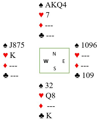 På kløver konge forsvinner hjerter 7 fra nord, og vest må enten gi opp sparholdet eller kaste hjerter konge slik at syds dame gir stikk.