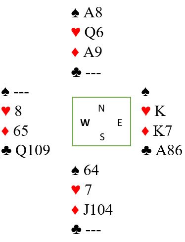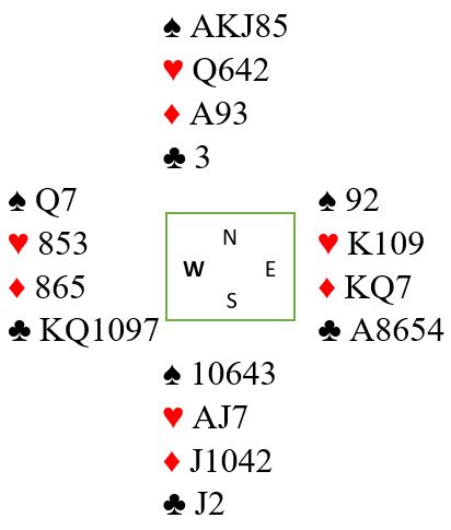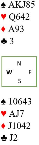 Det kom altså trumf ut til damen og honnør. I andre stikk syd spilles inn på spar 10 fulgt av kløver mot nord. Hvis øst vinner kløverstikket er det ikke noe godt skift til rød farge derfra. Så en andre runde kløver fra øst trumfes i så fall hvoretter det vil ordne seg med innspill mot øst senere. Men slik det sitter vil vest vinne stikket idet kløver spilles. Og derfra kommer ruter i skift som setter press på spillefører. Det legges liten fra nord, øst vinner med honnør og frir seg med kløver som trumfes hos nord. Nå er det tid for liten hjerter til knekten som vinner stikk slik det sitter, så ned med esset. Den sjansen med at øst kunne hatt hjerter konge dobbel lykkes ikke. men dette går bra likevel siden disse kortene er igjen: