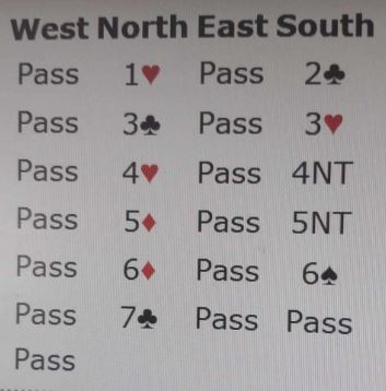 4NT var Key Card Blackwood med hjerter som trumf. Syds 6 spar var "Velg storeslem makker". Slik så hele spillet ut: