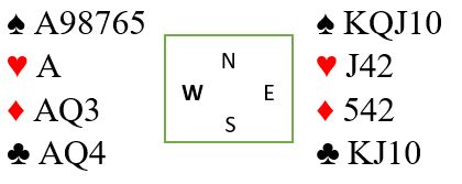 Du har som vest havnet i 6 spar og får hjerter konge i utspill fra nord. Spilleplan? Lynanalysen tilsier at dette er en bra slem. Det er ingen andre problemer enn ruterfargen. Ruter konge sitter jo hos syd i 50% av tilfellene, og i så fall er det kun en rutertaper. Dette er imidlertid ikke et spill hvor den finessen man ser er mulig å ta skal tas sånn uten videre. Det er med riktig spilleføring mye bedre sjanse enn 50% i dette tilfellet. Vel, det er faktisk bortimot 100% for å vinne tolv stikk i denne konteksten! Ser du løsningen?