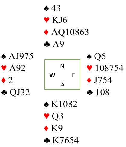 I dette spillet skal det spilles 3NT i lagkamp etter at vest åpnet med 1 spar (minst femkorts farge), nord meldte inn 2 ruter, syd inviterte med 2NT etter pass fra øst, og nord la på til 3NT.