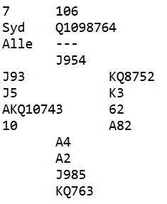 N/S kan i teorien alltid vinne ti stikk i hjerterkontrakt. Og det blir det fort i praksis også etter enten spar konge i utspill, eller ruterutspill, fargen vest trolig meldte ved alle bord. Det kan være mulig å gå bet i 4 hjerter om øst skulle finne et usannsynlig kløver ess i utspill fulgt av kløver til stjeling, så sparskift. Da må spillefører tippe hjerteren som etter den starten er knekten singel hos vest og K-3 dobbel hos øst. Damen må spilles slik at vests gjenværende single knekt "pinnes" ut. Da får ikke forsvaret flere trumfstikk enn den ene stjelingen. Hvis det etter en slik (usannsynlig start) spilles hjerter ess tapes dog ett stikk til i trumf og ett stikk i spar, og i så fall blir det kun ni stikk. I kløverkonrtakt N/S blir det en taper i spar og en i hjerter i tillegg til kløver ess.