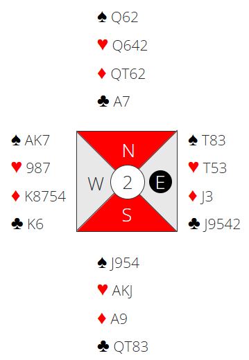 Det ser ut som det bør gå greit å vinne ni stikk om en ikke bommer veldig mye, men her er det altså en kan få fatt i mange ekstra poeng om det blir maks med stikk. Hvordan spille kontrakten er dog ikke så opplagt. Slik så hele spillet ut: