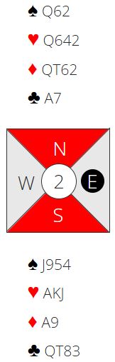 Det er klart i et stort felt er det sikkert noen som melder med vests kort, men over 1NT er det ikke bra med kun femkorts farge med en honnør. Merk at vest har nesten alt av uteværende honnører. Da er det ikke lett å spille motspill. Det er liksom ikke noe hjelp å få fra makkeren. Vest spilte ut liten ruter mot 3NT ved de fleste bordene. Enkelte prøver kanskje stor spar i utspill, men det er heller ikke noen trussel for spillefører, snarere tvert i mot siden spillefører med det utspillet fått en god start med hensyn til å godspille sparen for to stikk. Beste utspill slik kortene ser ut er faktisk hjerter som ikke hjelper spillefører på noen måte.