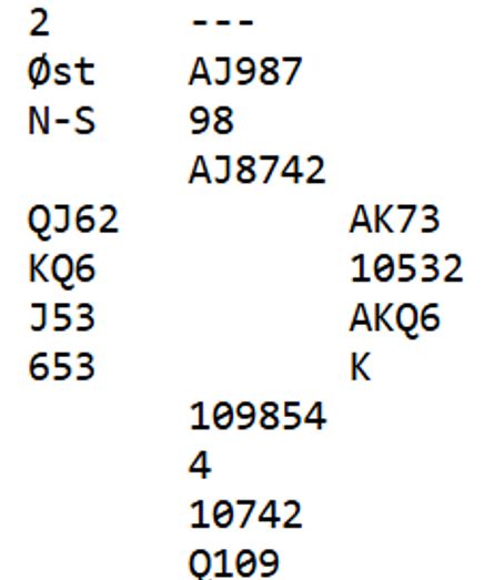 De fleste spiller med Lebensohl som er at 2NT-svar brukes med svake kort i denne situasjonen. Det ber makker melde 3 kløver. Så kan svareren passe eller korrigere til ruter for å spille der. Ved det ene bordet i en kamp valgte syd å si 2 spar. Da hoppet makkeren i 4 spar som syd ikke akkurat likte. Slik så alle kortene ut: