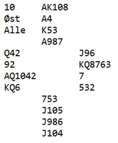 Fire av åtte spilleførere gikk bet i 4 spar. Tre vant +420 for ti stikk, mens Kristiansand altså noterte +590. som var verd 12 IMP.