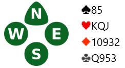 Du sitter øst med nord som giver og ingen i sonen. Nord og du på østs plass passer før syd åpner med 1 ruter. Over nords svar 1 hjerter hopper syd til 3 ruter, og nord avslutter med 3NT. Hva spiller du ut?