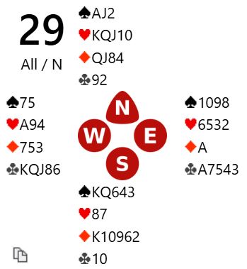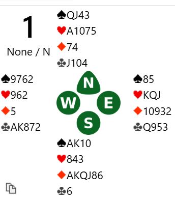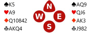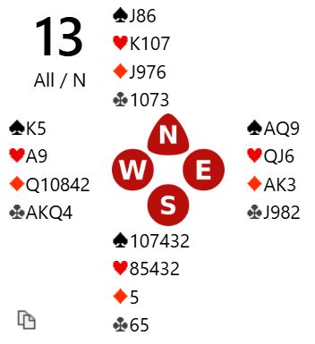 7NT er ingen dårlig kontrakt det heller. Om det er fem ruterstikk er det 3+1+5+4 = 13 enkle. Så 7NT står om ruteren sitter 3-2, knekten singel hos nord eller knekten fjerde hos syd. Det kan også bli tretten stikk om syd har alle de fem uteværende ruterne. Da blir det kun fire ruterstikk, men det trettende kan komme via hjerterfinesse, eller en skvis mot syd om han/hun har fem rutere og hjerter konge.
