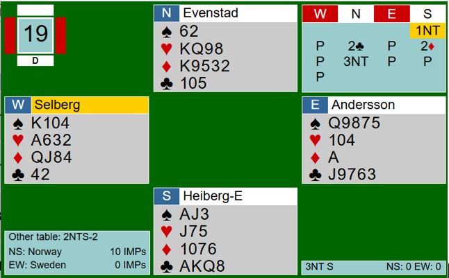 Ved det andre bordet hadde Stian Evenstad (nord) større ambisjoner og sa rett og slett 3NT etter å ha spurt med Stayman. Så de norske var altså i utgang på spillet som Sverige gikk to bet i delkontrakt ved det andre bordet. Utspillet var imidlertid av den særdeles uheldige sorten for utspilleren: Ruter dame!