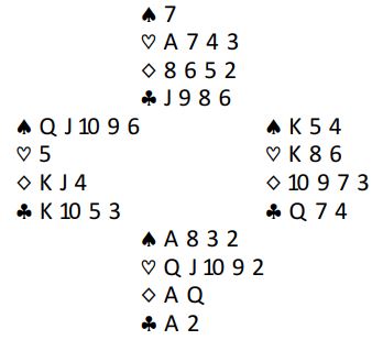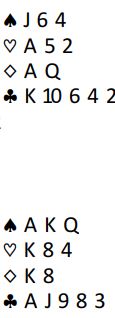 Det er egentlig ikke noen komplisert analyse i dette spillet. Hvis kløveren ordner seg er det tolv stikk. Det gjør den veldig ofte, 2-1 sits er jo ikke noe problem. Og om en av motspillerne har alle de tre uteværende kløverne går det også bra om det startes med honnør fra riktig side slik at det oppdages at en kan ta en markert finesse gjennom den motspilleren som har damen tredje. Men sitter det 3-0 og en legger ned feil honnør blir det bet i slemmen!