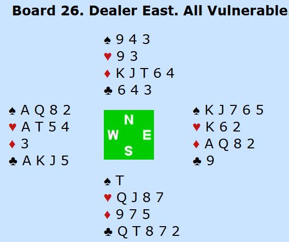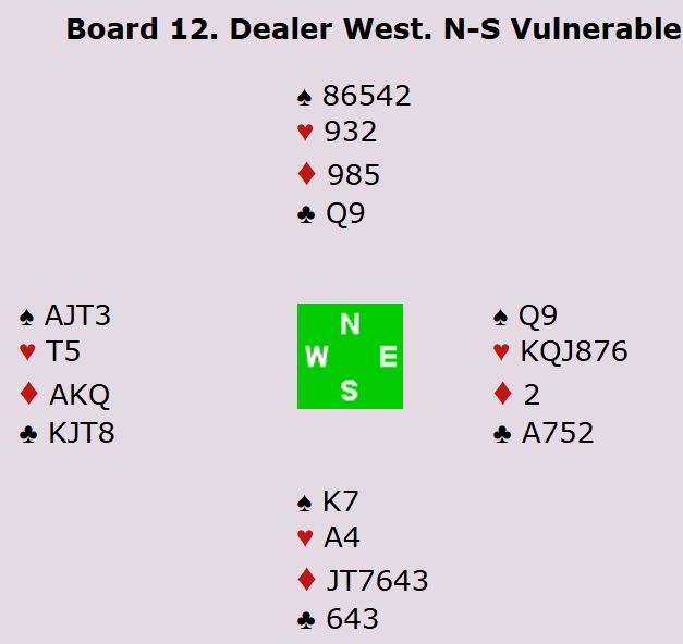 Alle fire Ø/V-parene var i 6 hjerter. Tre av dem fikk kontrakten på vest sin hånd, og det var mer komfortabelt siden sparen er beskyttet. Alle de tre som spilte 6 hjerter av vest vant tolv stikk.