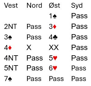 Det er en opplagt bet i 5 hjerter doblet, men da må N/S få med seg kløverstikket. Vel, med kløver ut og ruter tilbake blir det to doblede bet siden nord får seg en stjeling i tredje ruterrunde.