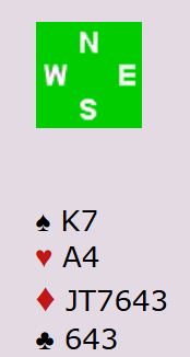 Vest er giver og N/S i faresonen. Vest åpner med 1 kløver, pass fra nord og 1 hjerter fra øst. Hva melder du?