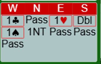 Jeg er ikke sikker på hva nord tolket syds dobling som, men meldingen hans tyder kanskje litt på at han trodde det var opplysende dobling? Eller er det grunn til å si 1NT som nord gjorde med de kortene han satt med hvis syd bare har vist hjerterfarge?
