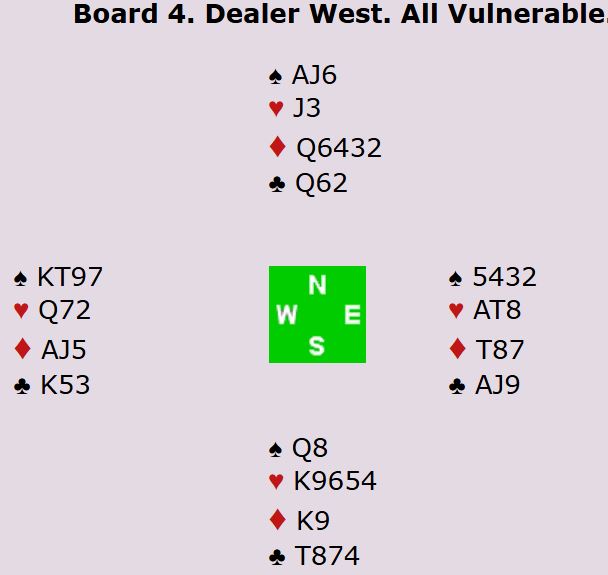 Åpningen 2 ruter sperret forsåvidt ut N/S som kan spille delkontrakt i ruter, og noen steder vant N/S 2 spar også. Det er uansett ikke lett for N/S å komme med i disse soneforholdene.