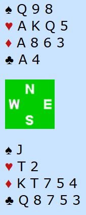 Der Grude-Charlsen (DE BOTTON) satt Ø/V åpnet sistnevnte som vest med 1 spar. Nord doblet, pass fra øst og syd sa 2 ruter. Nå meldte nord 2NT. En slike «forsinket» grandmelding viser sterkere kort enn for innmeldingen 1NT. Derfor la syd på til 3NT. Slik det var kunne ikke Ø/V ta fem sparstikk slik det satt, men spillefører må gjette litt etter liten spar ut fra øst til honnør fra vest, så liten spar derfra. Men det blir vel klart med oddsen å hoppe på med damen (vest har åpnet), og det går bra (vest har AK-femte). Så må ruteren ordne seg på samme måte som den må ordne seg uten taper i kontrakten 5 ruter. Ruter ess spilles og det går liten, liten og knekten fra vest. Hva nå?