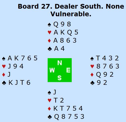 Vel, det avhenger av system hvordan disse kortene skal meldes. OVer åpningen 1 hjerter fra vest er det opplagt å svare 1NT. Men noen bruker Flannery 2 ruteråpning (normalt fire spar og femkorts hjerter, vanlig åpningsstyrke). Og det ble åpningsmeldingen der Willenken-Schaltz satt Ø/V for ROSENTHAL.