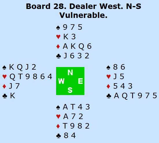 Uansett, mot Bakke-Brogeland ble nord spillende 1NT. Det gikk ikke bra. Det kom spar ut fra øst. Spillefører har to sparstoppere, men det er ikke lett å få mange stikk utenom det. Idet det ble spilt ruter til kongen og esset satte Ø/V opp sparen. Så var det omtrent slutt. Spillefører fikk ett stikk i ruter, for hjerter konge og to sparstikk – tre sonebet og ROSENTHAL noterte +300.