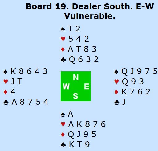 Storeslem er temmelig hardt, det mente i hvertfall de fleste av Ø/V-parene i finalen. Fem par spilte utgang, fem var i lilleslem og ett par hadde en meldemisforståelse og spilte delkontrakt. To par var i storeslem, ett i 7 kløver mens det norske paret tok toppen med 7NT tretten stikk og +1520.